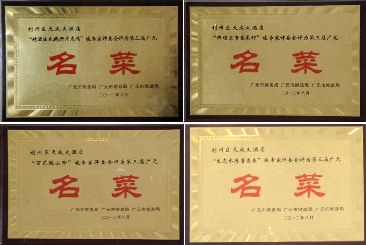 天成大酒店在“2013亞洲酒店業領袖峰會暨十大美麗酒店頒獎盛典”中獲得“十大最受歡迎綠色商務酒店”、“十大最受歡迎美麗婚宴酒店”等榮譽稱號,同時酒店被吸納為“中國旅游與酒店管理協會副協會單位;2012年8月天成大酒店菜品“錦繡富貴金龍蝦”、“百花釀三珍”、“女皇養身豆腐”、“生態水庫藿香魚”、“精酒法式鵝肝片皮雞”被評為第三屆廣元名菜;“天成養身宴”被評為第三屆廣元名宴;“一品蝦酥”、“紫薯雪山包”被評為第三屆廣元名小吃;